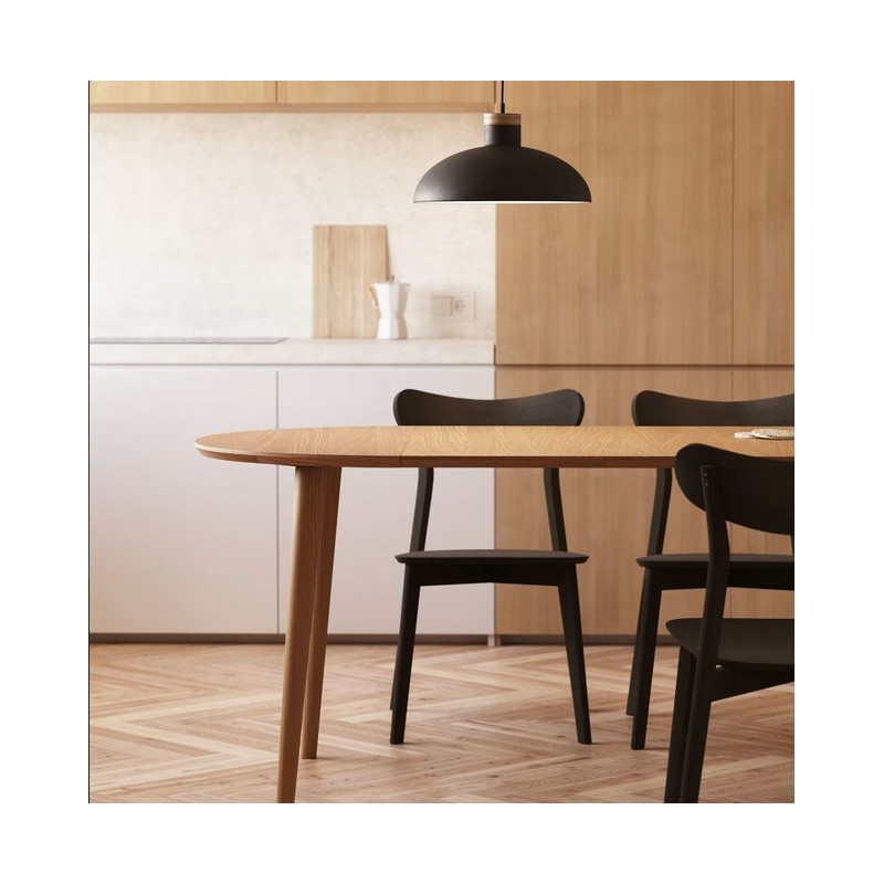 Round table extendable in oval with top made of natural oak plywood and rubberwood legs with extensions of up to 170cm.