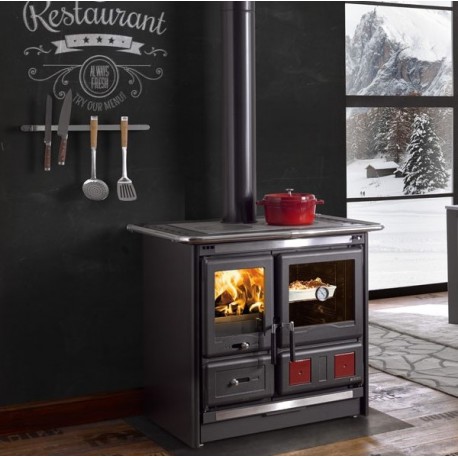 La estufa de leña Rosa L con horno de 55 litros de la marca La Nordica está fabricada en hierro fundido esmaltado. Con una potencia nominal de 9kW que puede calentar unos 232m3. La estufa de leña de hierro fundido utiliza troncos de madera de hasta 40 cm.