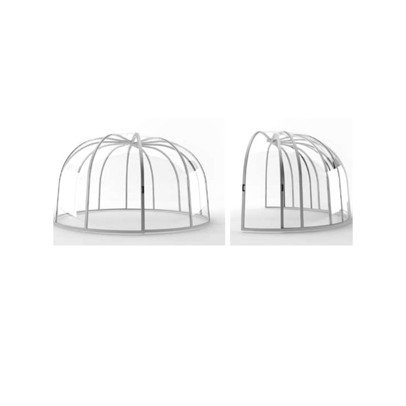 Este espacio móvil con un diámetro de 4,74 m y una altura de 2,30 m Formado por láminas de paneles transparentes de policarbonato completo de 3 mm para una vista panorámica desde su spa.
