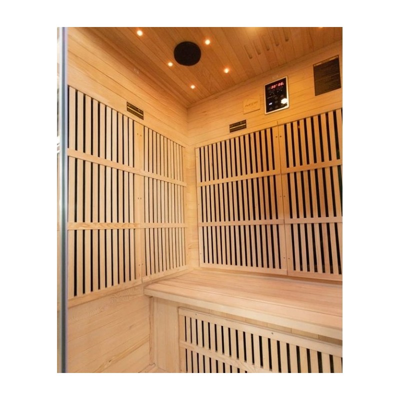 Sauna de infrarrojos VerySpa con tecnología Infrared Dos asientos panorámicos de 2 plazas en madera de abeto para disfrutar de un espacio arrullado por la calidez reconfortante de los paneles cerámicos.