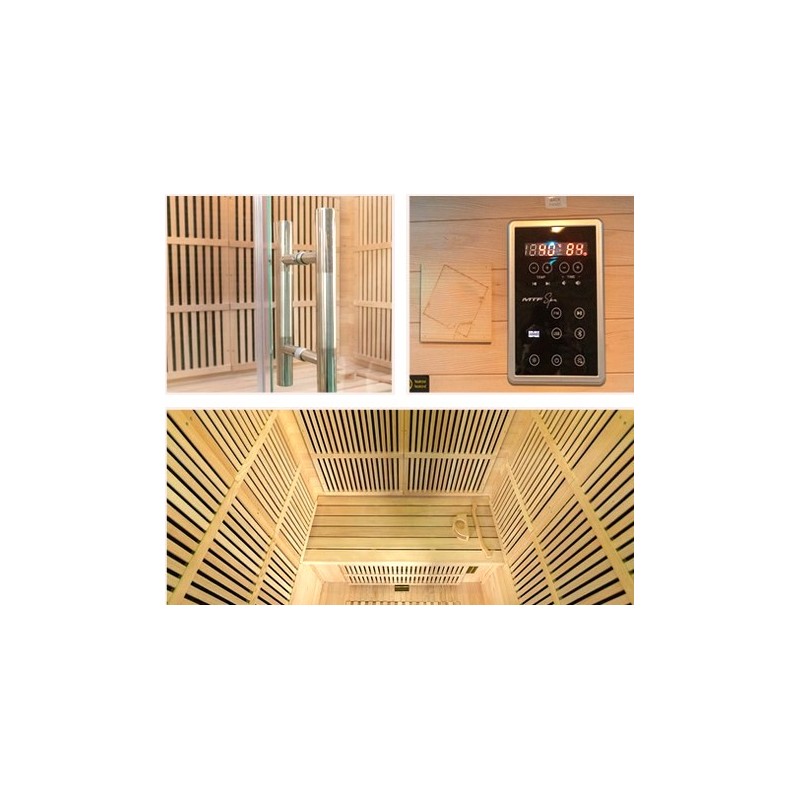 Sauna de infrarrojos VerySpas con tecnología Twin panorámica de 2 asientos en madera de abeto para disfrutar de un espacio arrullado por el calor reconfortante de los paneles cerámicos.