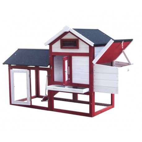 Le charmant poulailler en bois rouge et blanc offre tout le confort nécessaire pour 2 ou 3 poules.