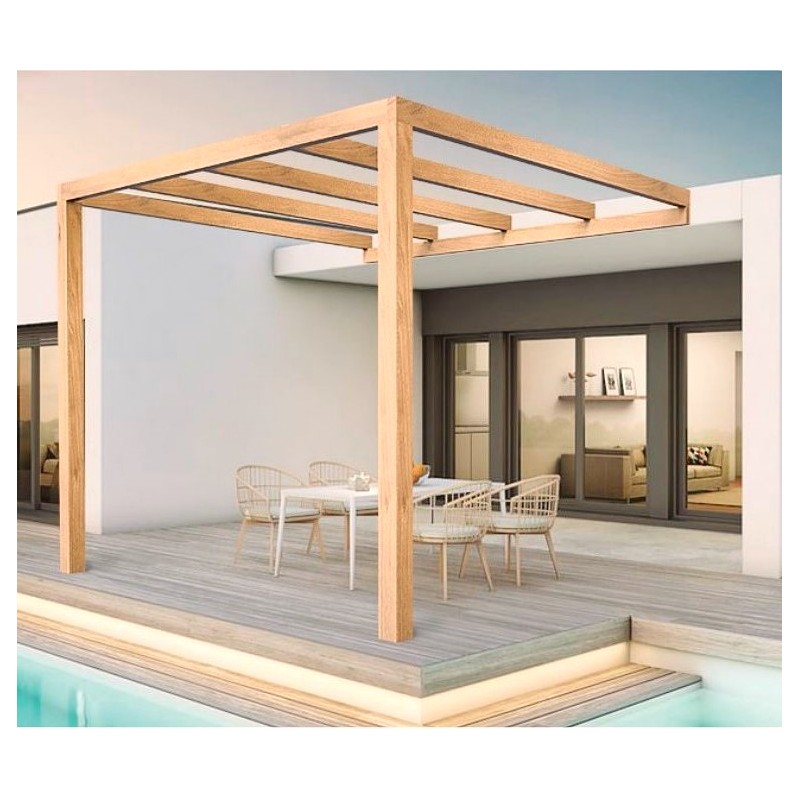 La Pergola Burgos en bois laminée adossée contre la façade de votre maison pour profiter d'une extension sur le jardin et la terrasse permet de moduler la lumière et le soleil avec une couverture de votre choix.