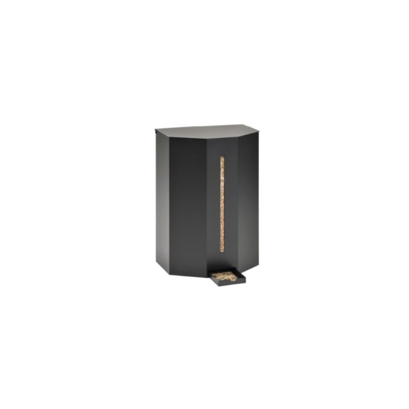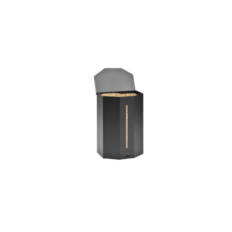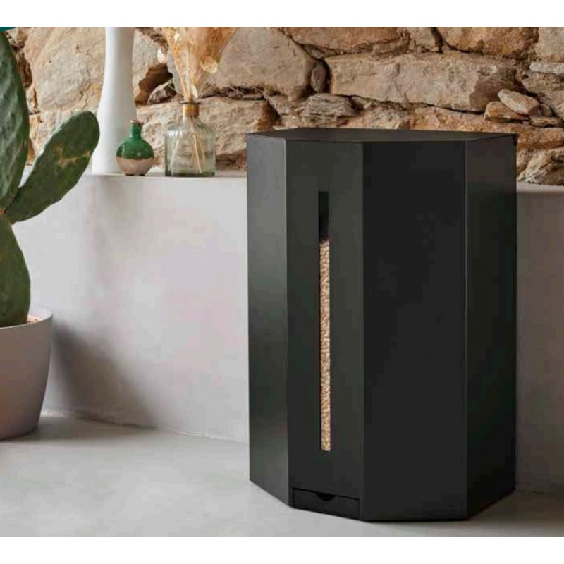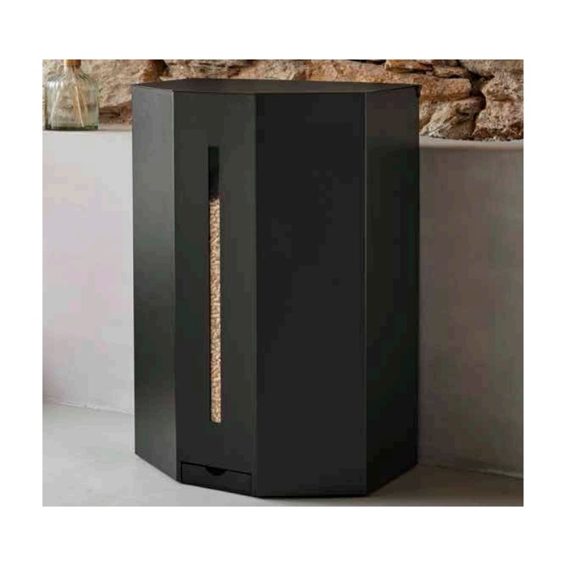 Com a sua forma inspirada em cristais naturais, esta reserva de pellets encosta-se a uma parede para poupar espaço na sala de estar.