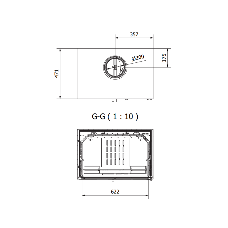 - Com uma caixa de fogo de ferro fundido e porta, dois ventiladores, um interruptor de luz, e um termostato